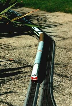 Die Terrasse wurde schnell zu klein, und man mußte auf den Rasen ausweichen. Dies ist bei frisch gemähtem und gepflegtem Rasen kein größeres Problem. Die Bettung der Roco-Gleise bügelt zumindest kleinere Unebenheiten aus, bei größeren muß man eben mal mit dem Hammer etwas nachhelfen. Dies ist besonders wichtig bei der Verwendung von US-Modellen, da diese durch ihre RP25- Radsätze etwas leichter entgleisen und die Kadee-Kupplungen zum Abkuppeln neigen. |