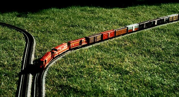 Der Betrieb erfolgt z. Zt. in analogem Gleichstrom ohne Blockstellen. Wasserdichte Weichenantriebe wären natürlich ein Traum, doch dafür ist die H0-Bahn leider nicht ausgelegt. Reizvoll ist auch der Nachtbetrieb, wobei hier allerdings durch einsetzenden Tau und diverses Krabbelgetier die Verschmutzung der Radsätze schnell zunimmt. Sämtliche in der Dunkelheit verkehrenden Züge sind daher "elektrische Einteiler". Das bedeutet, daß die Wagen über Elektrokupplungen miteinander verbunden sind, und auch die Lok mit dem Zug zusätzlich elektrisch verbunden ist. Durch diese extrem verbreiterte elektrische Basis verschmutzen auch die Radsätze kaum, da keine Mikroblitze zwischen Rad und Schiene entstehen können, die sonst den Schmutz auf den Radflächen einbrennen. Bei US-Güterzügen sind dann die Lokomotiven elektrisch verbunden. Der Betrieb von Güterzügen in der Dunkelheit ist natürlich weniger reizvoll. Ausnahmen sind hier nur Maschinen, die mit einem funktionierenden "Marslight" oder "Rotating Beacon" ausgestattet sind. |