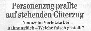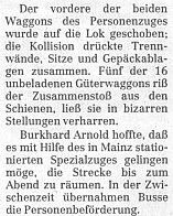 24.08.89, Ober-Ramstadt, Str Darmstadt - Eberbach, N 6622 bei Einfahrt in besetztes Gleis frontal auf im Bf wartende Üg 67753 geprallt (18 V) ... so lapidar liest sich dieser Unfall in Ritzau's "Katastrophen der deutschen Bahnen Teil II". Detailliertere Informationen liefert uns der Bericht im Darmstädter Echo vom 25.08.89, den ich ausgegraben habe und wiedergeben möchte. Glücklicherweise waren die Folgen dieses Unfalls nicht so gravierend, und die Zeit dürfte inzwischen die Wunden geheilt haben. Deshalb habe ich mich dann doch dazu entschlossen, ein paar Eindrücke und Bilder vom Ausmaß des Unfalls und den anschließenden Aufräumungsarbeiten hier zu zeigen. Direkt bzw. indirekt beteiligt waren übrigens folgende Loks: die Unfallgegner 212 219 mit dem N 6622 und 212 038 mit Üg 67753, sowie 212 218 mit dem Hilfszug und 212 119 mit dem Kranzug.