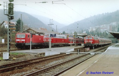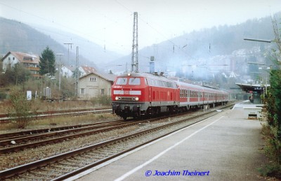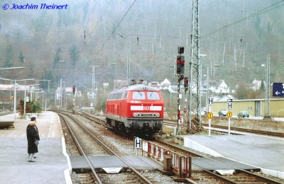Werfen wir zunächst einen Blick auf 218 227, die an ihrem gewohnten Abstellplatz mit laufendem Motor auf die Ankunft des RE aus Stuttgart wartet. Das Stumpfgleis befindet sich etwa in Höhe des ehemaligen Lokschuppens, an dessen Stelle heute ein Park-and-Ride-Parkplatz ist ... |