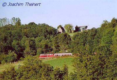 ... scheinbar noch keine dunklen Wolken über diesem Regional-Express, der an einem strahlenden Spätsommernachmittag unbeirrt gen Eberbach strebt. Und trotzdem läutet für DB-Regio bereits die Totenglocke, als der Zug in einiger Entfernung die Kapelle am Lauerbacher Friedhof passiert ... |